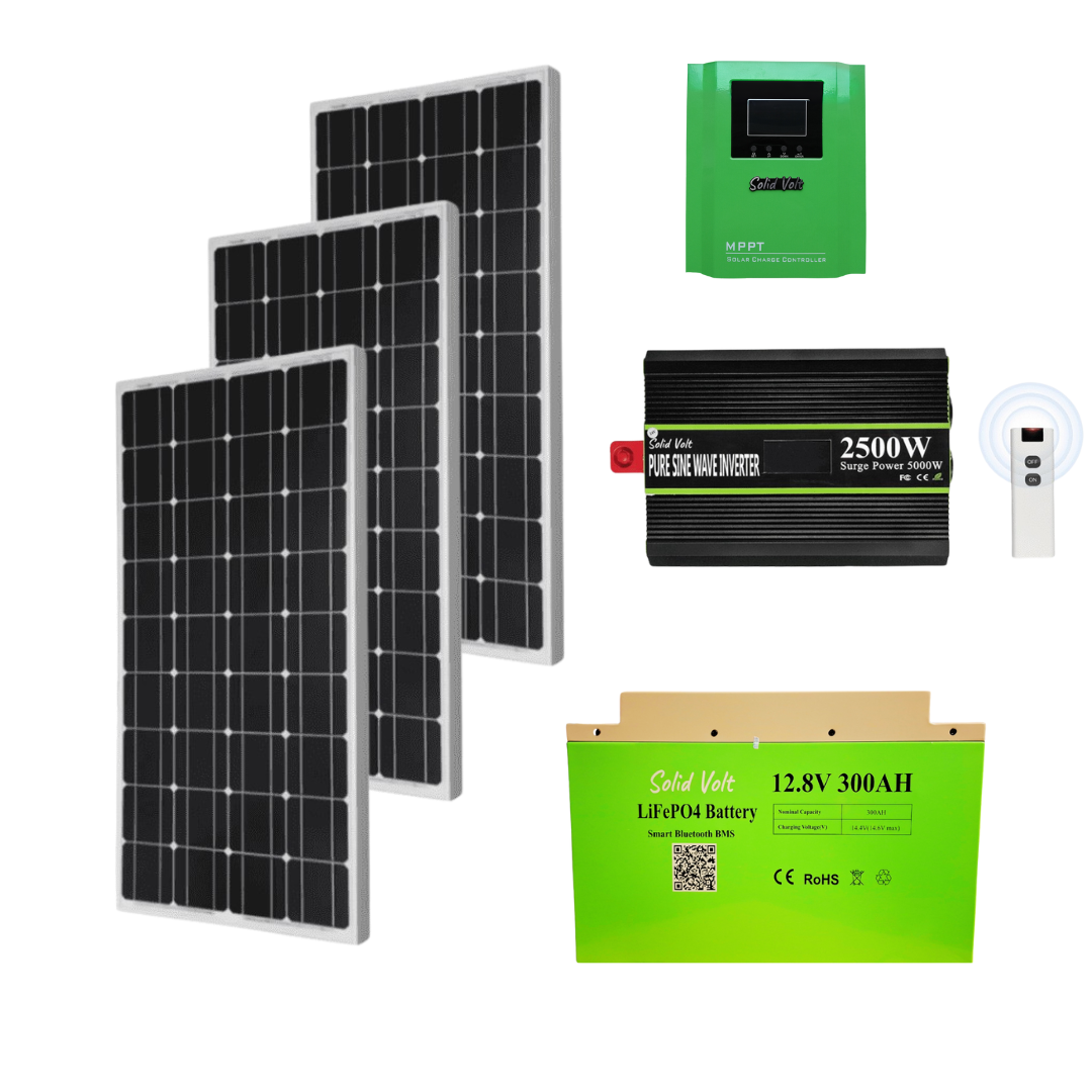 Sistem/kit fotovoltaic cu 3 panouri solare 200W + Invertor sinus pur 2500W/5000W Solid Volt + MPPT 60A + baterie LiFePO4 litiu 300Ah + conectori si cablu